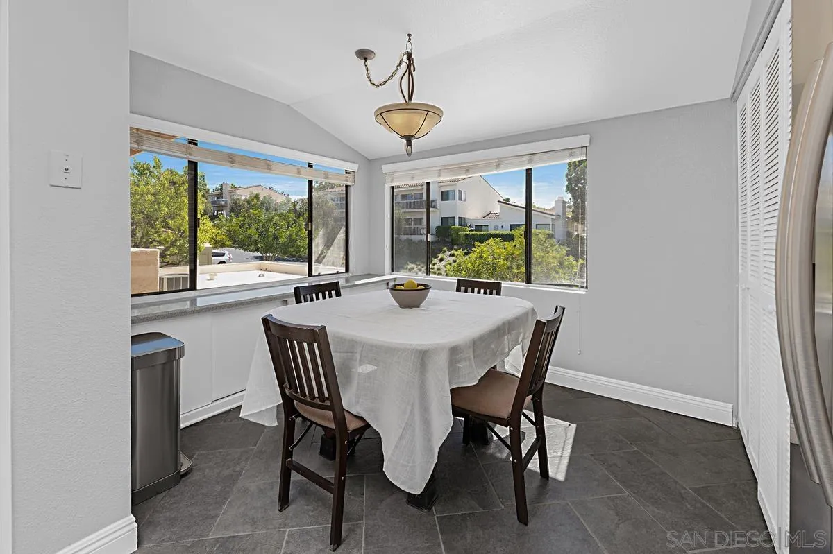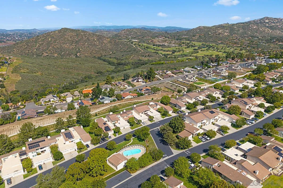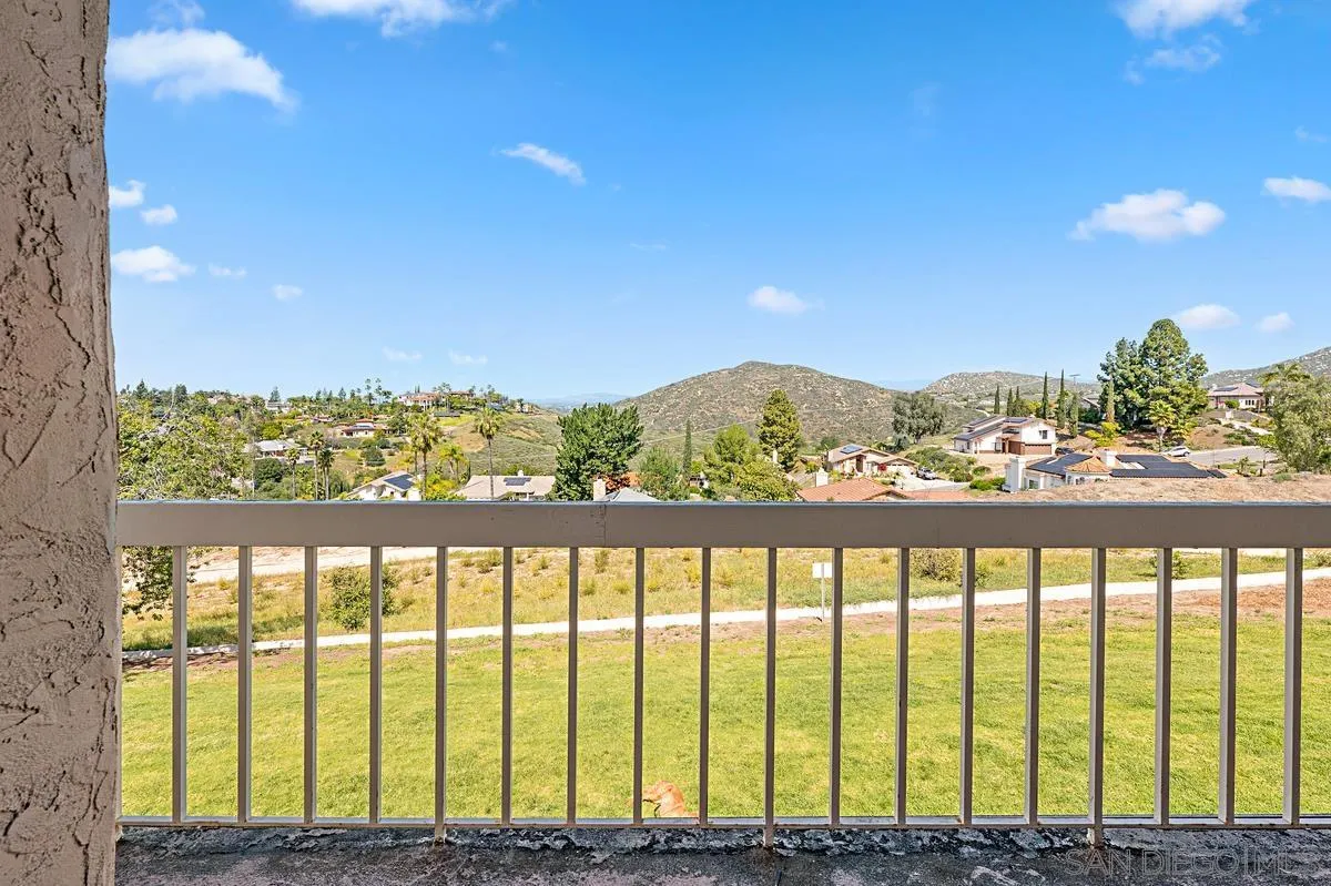 Best value in Stoneridge Chateaus, this top-floor home is ideal for buyers who value privacy, quiet, and natural light over ground-level access. With no neighbors above, vaulted ceilings, and open mountain and greenbelt views, it offers a brighter and more peaceful living experience than lower-level units. One of the largest floor plans at 1,624 sq ft, featuring 2 bedrooms, 2 bathrooms, and a versatile bonus room for an office, den, guest space, or potential third bedroom. The living area includes a fireplace, large windows, and real cherry wood flooring throughout the main spaces and bedrooms. The updated kitchen offers ample cabinetry, breakfast area, and in-unit laundry. The primary suite enjoys scenic views and generous closet space, while the secondary bedroom is well separated for privacy. Oversized detached garage, ample guest parking, and HOA coverage for water, trash, exterior maintenance, roof, landscaping, and master insurance. Conveniently located near Lake Poway, Bernardo Winery, shopping, dining, and Poway Unified schools.