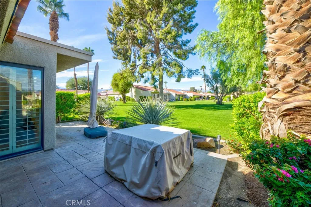 GORGEOUS! upgraded Olympic model located in Palm Desert Resort Country Club, just steps from the pool and spa with relaxing greenbelt and mountain-view surroundings. This beautifully maintained home features an open and bright floor plan with high ceilings, recessed lighting, and large slider that bring in natural light and views of the landscaped grounds. The upgraded kitchen includes granite slab countertops, a spacious center island with cooktop and seating, stainless steel appliances, custom cabinetry with glass inlays, and a warm tile backsplash. The kitchen opens directly to the Great Room, creating a seamless space for dining and entertaining. Tile flooring runs throughout the home with large ceramic tiles laid on the diagonal for a stylish and low-maintenance finish. The split-bedroom floor plan offers excellent privacy. Both bedrooms are spacious with mirrored wardrobe closets. The bathrooms include granite countertops, upgraded fixtures, and tiled walk-in showers. Additional interior features include a newer high-quality water heater and a recently added washer and dryer located in the attached garage. Outdoor living is highlighted by the private back patio with stamped concrete, mature desert landscaping, and wide greenbelt views. A spacious attached garage provides extra storage. Palm Desert Resort C.C. is a guard-gated community offering an 18-hole golf course, lighted tennis and pickleball courts, over 20 pools and spas, and a clubhouse with dining, lounge, and golf shop. The HOA maintains exterior landscaping. This home is ideal for full-time living, seasonal