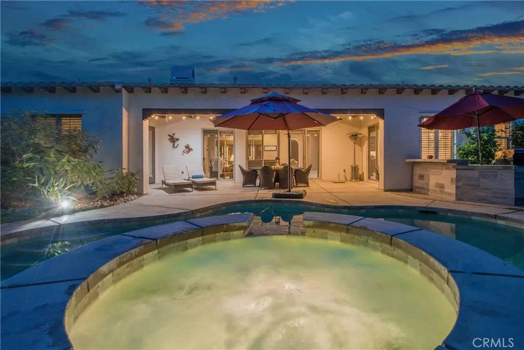 Spanish retreat located in the Estates of Carmela. This home captures the essence of La Quinta resort-style living with its striking Spanish architecture and inviting, open layout. High ceilings and graceful arches add character throughout the interior, enhancing the resort feel. The entry features a large, enclosed courtyard accessed through French doors, promoting wonderful indoor-outdoor flow. The expansive great room connects seamlessly to this courtyard on one side and, on the other, opens via three sliding doors to the spacious, private backyard oasis, complete with a pool and an enclosed California Room. The great room is open to the gourmet kitchen, which features a center island, beautiful designer lighting, a large walk-in pantry, and a butler's pantry/prep area with extensive storage and cabinet space. Designer lighting is a feature throughout the entire home. The large Primary Suite is a true retreat, offering a separate French door entrance to the backyard. The Primary Bathroom includes a spacious walk-in shower, dual sinks, a separate soaking tub, and a large walk-in closet. The two guest bedrooms are generously sized. One features a private outdoor sitting area, and the other is large enough to function as a casita or office and includes French doors opening to the main entry courtyard. The guest bathroom is equipped with dual sinks and a large shower/bath combination. The backyard is spacious and private, providing numerous enclosed areas perfect for relaxing around the pool. It also features a custom BBQ island and a beautiful pergola for additional seating