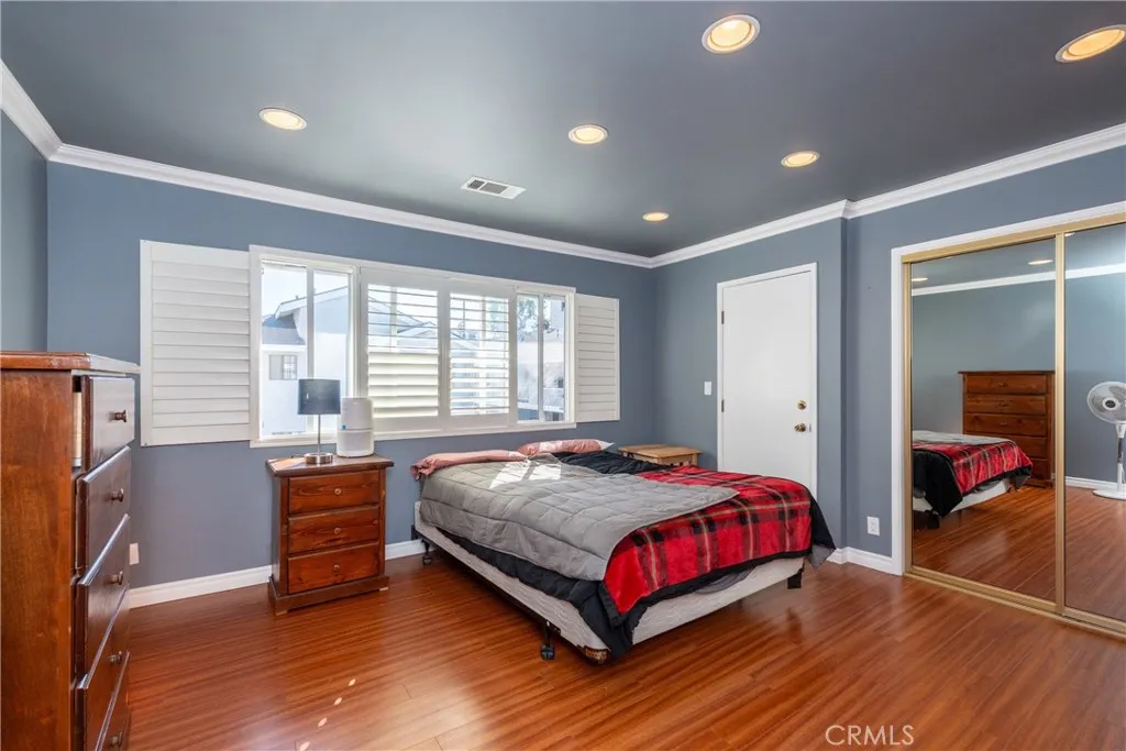 Discover this beautifully upgraded spacious two-story townhouse, offering comfort, style, and exceptional functionality throughout. Step inside to find laminate wood flooring, crown and base moldings, plantation shutters, smooth-finished walls, recessed lighting, and double-pane windows that enhance energy efficiency. The home also features both air heating and air conditioning for year-round comfort. The cozy living room showcases a charming fireplace and a double-pane sliding door that opens to a private outdoor patio perfect for relaxing or entertaining. The kitchen is designed for convenience and durability, complete with solid wood cabinetry, Blue Pearl granite countertops, a double-door refrigerator, stove, dishwasher, microwave, water filtration system, and an additional side bar with extra storage. Upstairs, the primary bedroom includes a private covered balcony, a lighted walk-in closet, and an in-wall ironing board with electrical outlet. The spacious second bedroom features a top-of-the-line built-in Murphy bed, custom cabinetry, and a large lighted closet. Both bedrooms share a remodeled Jack-and-Jill bathroom. The upper level also includes ample linen storage and a dedicated washer/dryer area. A steel staircase provides access to a generously sized attic, offering even more storage options. The property includes two assigned parking spaces for added convenience. Community amenities include a Jacuzzi, patio area, and BBQ grill. Ideally located near shopping, dining, and the 405 freeway, this home combines comfort, upgrades, and convenience in one perfect package