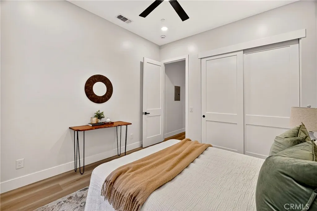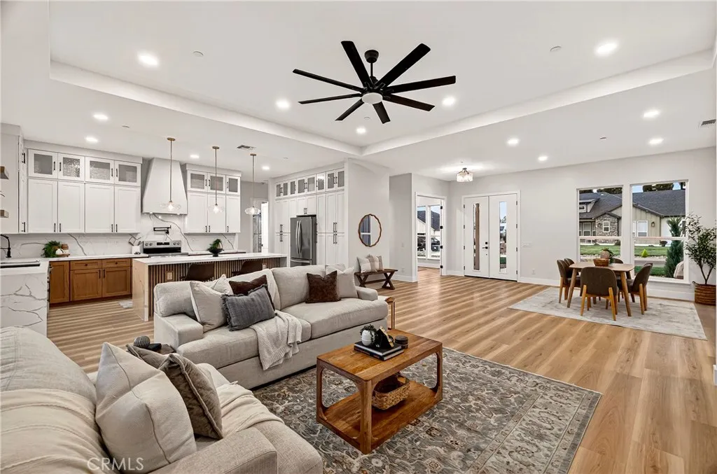 This exceptional brand-new modern farmhouse offers 3 bedrooms + dedicated office/den, 2.5 baths on a private court lot with landscaped grounds and full irrigation. High-end finishes include Calacatta-style quartz counters, two-tone white and rift oak cabinetry, matte black fixtures, and upgraded premium waterproof laminate flooring in a natural European oak finish. Open great room flows into a gourmet kitchen with dramatic waterfall island, paneled stainless appliances, full-slab backsplash, and gold-accented pendant lighting. The dedicated office/den features a custom wood slat accent wall. Primary suite delivers a spa-inspired bath with dual floating vanities, frameless glass shower with rainfall head, sculptural freestanding tub, and spacious walk-in closet with built-in organizers. Additional upgrades: owned solar panels, tankless water heater, dual-zone HVAC, laundry room with sink and storage, and oversized 2-car garage. Gated RV parking. Turnkey luxury in every detail.
