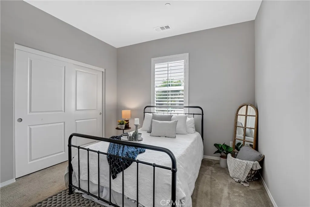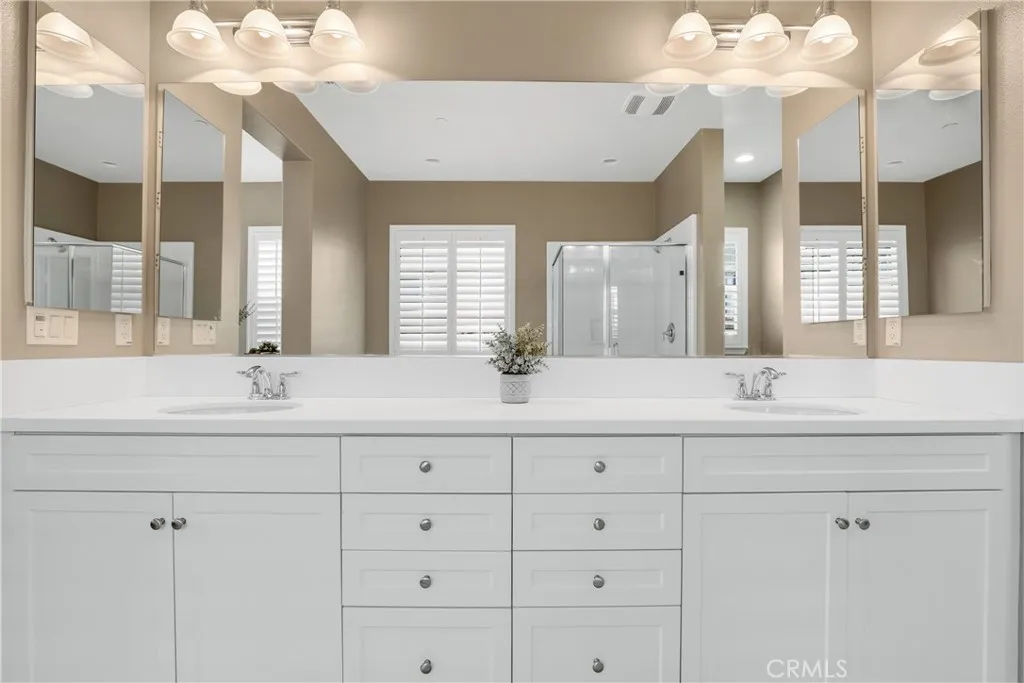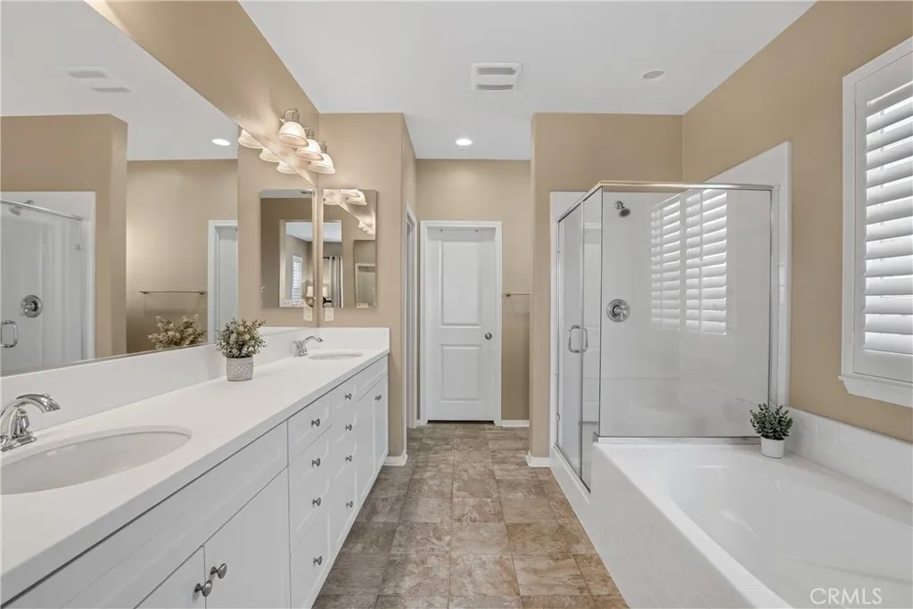 Highly sought-after single level home, ideally located in the prestigious and highly desirable Heritage Lake community, offering the best in resort-like living. The manicured drought resistant landscaping and Spanish influenced stacked stone entry creates a stunning first impression. Step inside and soak in the light filled interior with gorgeous wood laminate floors, a neutral palette, plantation shutters, and recessed lighting throughout the well-designed open concept floor plan, all providing an ideal living environment. The living area is a welcoming gathering space around the fireplace, perfect for relaxing with loved ones. The ample dining space has sliders opening to the back yard patio, a superb indoor-outdoor living area for entertaining. The expansive kitchen is a dream with Granite countertops, timeless White Shaker cabinetry, stainless-steel appliances, prized coffee bar/workspace, and abundance of countertop and storage space, and a huge center island with breakfast bar. The Primary Suite is a peaceful retreat with a roomy primary with gorgeous tile flooring, Quartz topped dual vanity, soaking tub, and oversized step in shower. Two spacious guest bedrooms and a sparkling guest bath complete this superb floor plan. The backyard is a tranquil oasis with easy care landscaping. Additional fine features include a tankless water heater and a convenient indoor laundry room. Just a short walk to Heritage Lake, Heritage Lake Park and local schools. Residents enjoy resort-style amenities including a 7,000 sq. ft. clubhouse, access to a private 25-acre lake for catch-and-