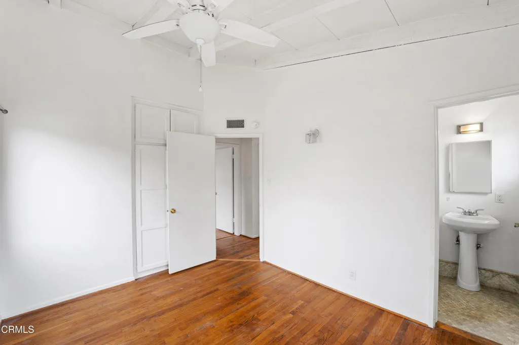 Mid-century California coastal-inspired single-story home showcasing a clean stucco exterior, iconic low-pitched gable roof, and wide overhangs that reflect classic West Coast design. Located in the heart of Midtown Ventura, this home offers a relaxed coastal lifestyle with the convenience of a central, walkable neighborhood. The living and dining areas showcase classic mid-century character with open, light-filled spaces and architectural detail throughout. The living room features exposed beam ceilings, warm hardwood flooring, and a ceiling fan with light, creating a comfortable and inviting gathering space. Neutral wall tones enhance the sense of volume, while natural light highlights the wood floors and clean lines. Updated kitchen featuring warm wood raised-panel cabinetry with crown molding, polished granite countertops, and a full-height linear glass tile backsplash. The space is anchored by durable porcelain tile flooring laid in an offset pattern and complemented by stainless steel appliances, including a gas cooktop, built-in oven, microwave, refrigerator, and dishwasher. A double-basin sink with a commercial-style pull-down faucet sits beneath a large window, filling the kitchen with natural light. Recessed lighting, neutral wall tones, and a functional galley layout create a clean, cohesive, and move-in-ready kitchen with timeless appeal.The backyard offers a private and functional outdoor setting with a spacious paved patio ideal for outdoor dining, entertaining, or lounging. Concrete pavers with brick inlay create defined gathering areas, while raised planter