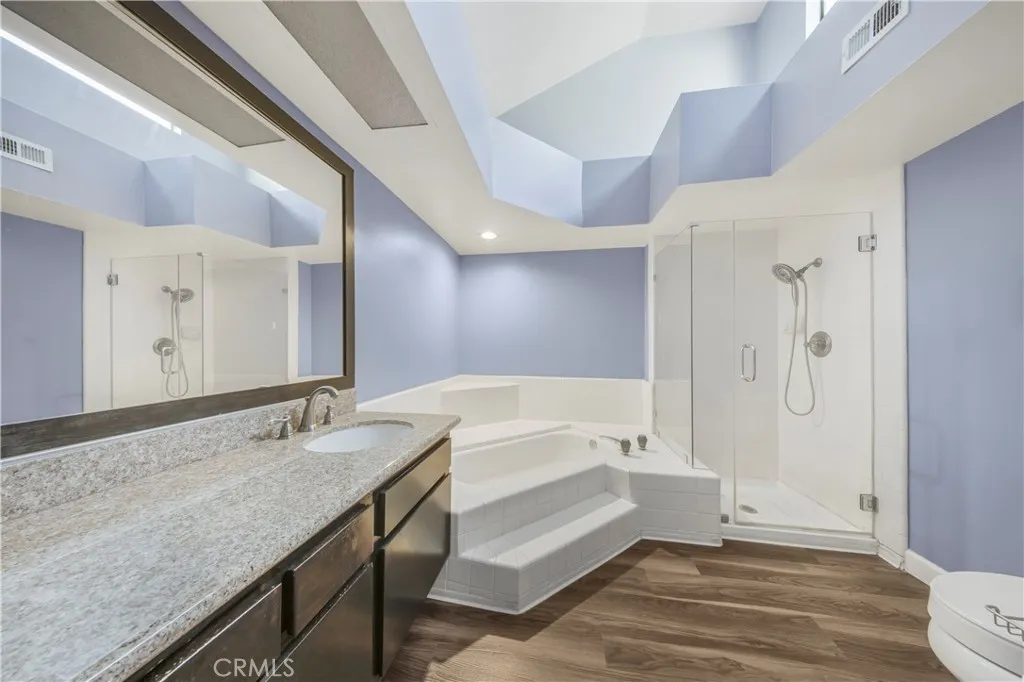 An oversized 2-bedroom, 2-bath condo offering 1,160 sq ft of comfortable, well-designed living space. This inviting home features luxury vinyl flooring throughout, vaulted ceilings, and abundant natural light that enhances the open floor plan. The living room is centered around a cozy fireplace and opens to a private balcony with peaceful community views, perfect for relaxing. The kitchen offers a pantry, stove, dishwasher, and microwave, with a separate dining area ideal for everyday living or entertaining. A convenient in-unit laundry area located in the hallway includes a stackable washer and dryer. Both bedrooms are generously sized and offer plenty of closet space. Parking is easy with a detached 1-car garage plus an additional assigned covered carport. The Stonebridge Association provides excellent amenities, including three pools, a spa, trash service, and insurance. Centrally located near major freeways, shopping, dining, and entertainment. VA-approved community.
