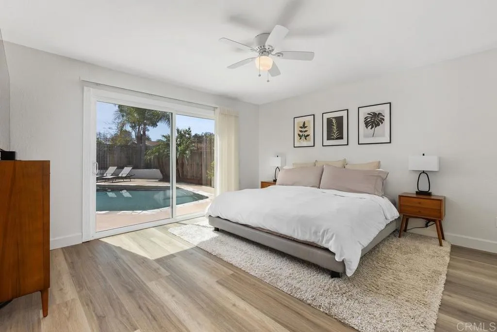 Enjoy relaxed coastal living in this beautifully updated, very private home featuring a resort-style backyard with a pool, spa, owned solar, ocean views, and no HOA. The main living spaces feel open and inviting with luxury vinyl plank flooring throughout and an easy flow between the kitchen, dining, and living areas. The living room offers a fireplace and surround sound, while the kitchen is equipped with granite countertops, stainless steel appliances, and bar seating that connects comfortably to the living space. The adjacent family room opens with a sliding door to the yard, where the BBQ island and patio overlook the pool creating a seamless indoor-outdoor connection ideal for entertaining. Remodeled half bath completes the main level. Upstairs offers three bedrooms and two updated bathrooms. Two bedrooms share a Jack-and-Jill bath, while the third is served by a separate hall bathroom. Two of the bedrooms open to a spacious deck where you can enjoy mountain and ocean views on clear days. The primary suite provides a private retreat with direct access to the backyard and pool, along with a beautifully remodeled bathroom featuring dual sinks and a walk-in shower. The backyard is designed for both relaxing and entertaining with a multi-level layout, pool and spa, and a covered patio with a BBQ island, all surrounded by mature landscaping. The pool includes a pebble finish, saltwater system, recently replaced pool vacuum, and solar heating. Additional improvements and features include owned solar, air conditioning, newer windows, interior and exterior paint, updated blind