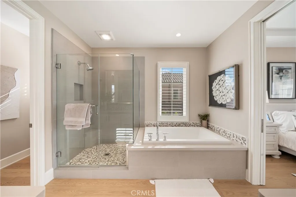 Located in the highly sought-after Reserve at Orchard Hills, a prestigious 24-hour guard-gated community, this beautifully upgraded home features a rare, generously sized backyard with desirable south- and east-facing exposure, allowing for abundant natural sunlight throughout the day. Thoughtfully designed for both relaxation and entertaining, the outdoor space includes a built-in BBQ and ample room for gatherings, creating a bright and inviting extension of the home. Inside, the home showcases model-home level upgrades throughout, with a bright and open-concept layout on the main level. The living room, dining area, and kitchen flow seamlessly together, enhanced by multiple large sliding glass doors that open to the backyard and fill the space with natural light. The kitchen is both stylish and functional, featuring ceiling-height cabinetry, quality finishes, a spacious layout, and a walk-in pantry. A main-level ensuite bedroom provides flexibility for guests or multi-generational living. The first floor is finished with upgraded, durable stone flooring, while the second level features elegant French oak wood flooring, adding warmth and sophistication throughout. Upstairs, the home offers a spacious primary suite and two additional bedrooms. The primary suite is filled with natural light from large windows and features a well-appointed ensuite bathroom with dual vanities, a soaking tub, a walk-in shower, and a walk-in closet, creating a comfortable and functional private retreat. All bathrooms are upgraded with finishes selected from the original model home package, creat