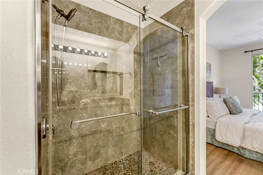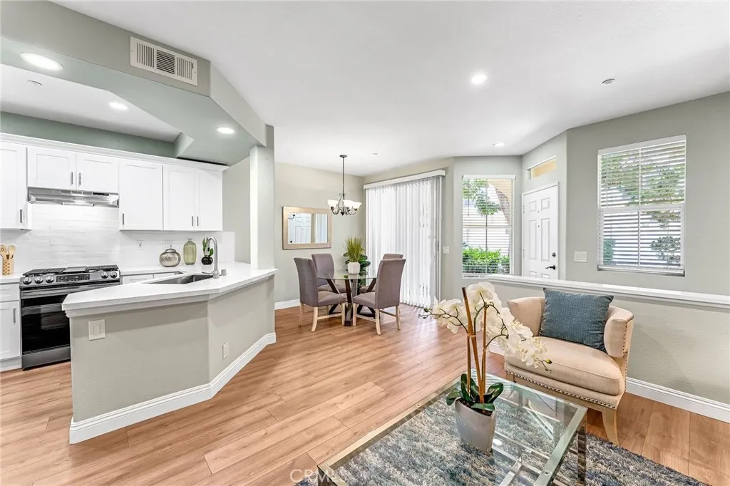 Located in the highly sought-after, gated Oak Creek community, this impeccably maintained two-bedroom, two-and-a-half-bath townhome-style residence is the perfect blend of elegance, comfort, and convenience. The inviting living area showcases an open-concept kitchen, a charming cozy fireplace, and a generous family room and dining area an ideal setting for entertaining and everyday living alike. The beautifully remodeled kitchen is a true showstopper, featuring stunning white shaker cabinets, gleaming quartz countertops, a farmhouse-style stainless steel sink and faucet, along with a four-burner gas range and dishwasher. Also conveniently located on the main level are a dedicated laundry room and a stylish powder room. Rich luxury vinyl wood-style flooring flows seamlessly throughout the entire home, striking the perfect balance of sophistication and durability. Upstairs, the expansive primary suite is a true retreat, complete with a ceiling fan, a spacious walk-in closet, and a private balcony perfect for morning coffee or evening relaxation. The spa-inspired en-suite bathroom boasts a dual vanity and an oversized walk-in shower. The well-appointed secondary bedroom features a mirrored wardrobe and its own full bathroom with a bathtub. Thoughtful finishing touches include a sun-drenched skylight at the top of the stairs, convenient linen cabinets in the hallway, and a two-car tandem garage with direct access. The Oak Creek community elevates everyday living with resort-style amenities, including three sparkling pools, rejuvenating spas, tennis and sports courts, playgroun
