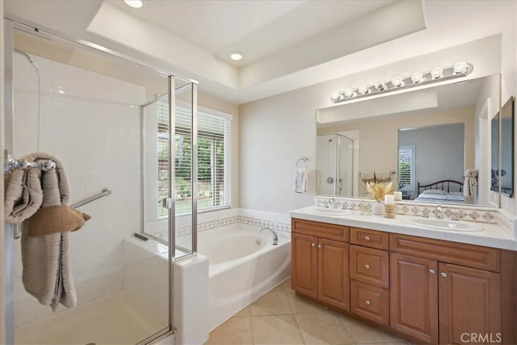 Welcome to this lovely home with a highly desirable floorplan boasting a DOWNSTAIRS PRIMARY BEDROOM and 2 additional downstairs bedrooms, 3 downstairs bathrooms, and a Jr. Primary Bedroom upstairs w/a Full Bath! This floorplan is so versatile and can support a multitude of living situations. The downstairs primary bedroom has a spacious walk-in closet, large bathroom vanity area with a separate tub & shower, and a privacy door for the commode. The 2 additional downstairs bedrooms share the large hall bathroom with dual vanity sinks and a privacy door for the commode and shower/tub. The guests have their own powder room. The living space is open and light with high ceilings open to the loft and windows throughout, allowing natural light to flow seamlessly. The loft is a great space that can be utilized as an office, a gym, a tv area, or even an extra bedroom if needed. From the loft area, there's a short hallway with storage cabinets leading to the Jr. Primary Bedroom and Bath. The backyard is adorned with many seasonal flowers, grapevines, alumawood patio cover that stretches the entire length of the house, and a large shed. The indoor laundry has a sink and a counter for folding clothes. The roomy 3 car garage nearly completes this fabulous house... it's just looking for you to make it your new home.