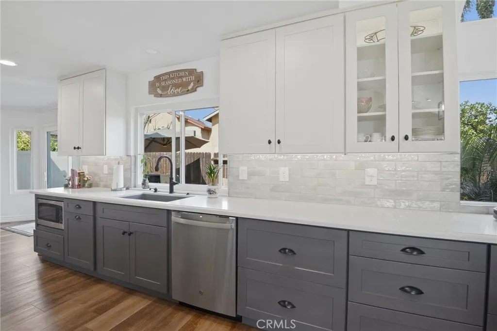 Beautifully updated 4 bed, 3 bath home featuring a truly show-stopping, expanded kitchen designed for entertaining. This reimagined space offers exceptional cabinetry and extended counter space that flows seamlessly from the kitchen through the dining areacreating one continuous serving and gathering space. Highlights include white cabinetry, stainless steel sink, newer appliances, abundant storage with soft-close doors and pull-out drawers, and a generous serving bar perfect for hosting. The versatile floorplan includes a spacious, sun-filled main-floor bedroom with a full downstairs bathroom, ideal for guests, extended family, or a private home office. Upstairs, the primary suite offers a remodeled bath with a travertine shower, granite countertops, and a walk-in closet. Secondary bathrooms are tastefully upgraded with newer cabinetry, granite surfaces, and updated fixtures. The main level showcases wide-plank luxury vinyl flooring, complemented by carpeting in all bedrooms for comfort. The home also features inviting outdoor spaces, including a charming front patio perfect for conversation and a backyard designed for entertaining. Both front and rear yards are beautifully landscaped with palms, lush lawn, and colorful plantings, creating strong curb appeal. A rare combination of thoughtful upgrades, exceptional kitchen design, and indoor-outdoor livingthis home is made for gathering, hosting, and enjoying. Creekside HOA in Ontario offers a well-rounded, lifestyle-oriented setting with multiple community pools and spas, tennis courts, playgrounds, picnic and BBQ areas, an