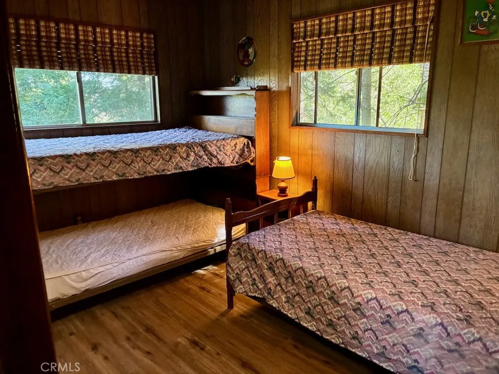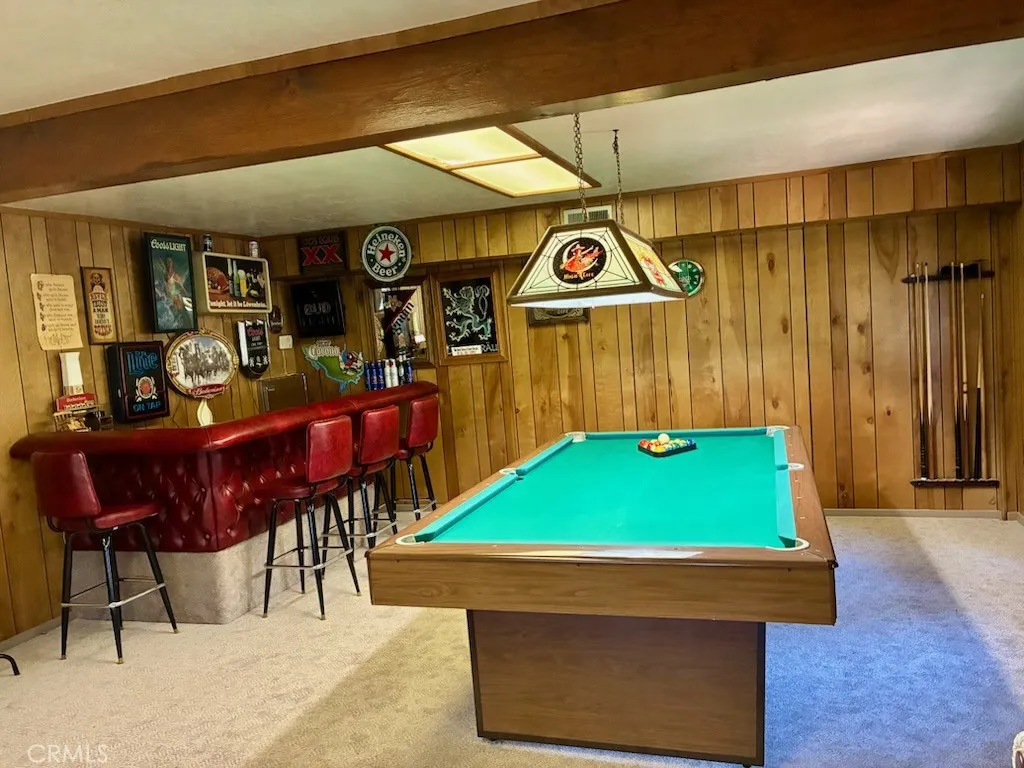 Nestled among the pines of Crestline, this charming mountain retreat provides off-street parking for up to 3 cars. Upon entering the dramatic floor to ceiling stone fireplace warms the spacious living room and its expansive windows, paneled walls and gorgeous open beam ceiling. Newer hard flooring spans the upper level. The original well-maintained kitchen cabinets further emits the cabin feel. Gain access to the walk out 7x24 balcony/deck through the sliding glass doors and enjoy a sweeping view of the woods below. The master bedroom, secondary bedroom and full bath complete the first level. A staircase leads down to the second level...the approx. 425 sq. ft. newly carpeted bonus room boasts a built-in bar, a pool table, plenty of room for seating and a wood burning stove for those cool evenings. The third bedroom and second bathroom is located on this level as well. The washer/dryer is located in the utility room with a pedestrian door to the outdoors. There is plenty of room for storage. Crestline offers an abundance of opportunities for year round outdoor activities...from relaxing at Lake Gregory enjoying all the water sports of swimming, fishing and boat rentals in the summer to skiing the slopes in Big Bear in the winter. Welcome home to your mountain retreat!!