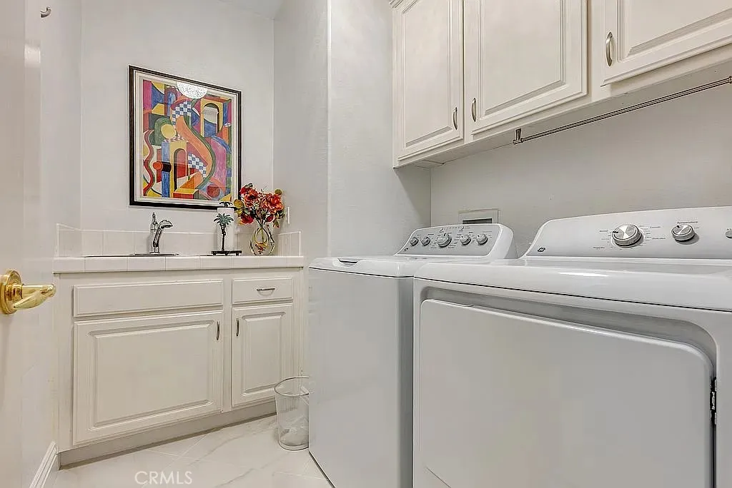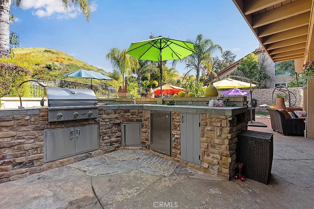A half acre lot located at the end of a cul-de-sac features a tropical grotto pool setting with water spouts, waterfalls, and fountain. A ten person spa provides party fun. Privacy is the key word to describe this home as a picturesque hill provides backyard privacy. Exterior side walkway is perfect for guests arrival when entertaining. Large Master bedroom is enhanced by French door opening onto a 300 sf deck overlooking pool and private hillside. Master Bedroom with Bidet. Two fully built out walk in closets lead you to your large bath with spa tub, new glass enclosed shower, and remote controlled window coverings. Your kitchen was taken down to the studs in 2025 and designed to work with any color you choose as it has a blend of various shades of cool grays and cream in countertops and cabinets that extend clear to the ceiling. New soft white porcelain floors throughout kitchen, family room, laundry and hallways. Kitchen offers an island and separate informal eating area with designer chandelier. Family room has new window shades and fireplace tile. Home has two full and two half baths, one half bath serves the pool with outside entry, no wet feet in your home. Enjoy a private, formal dining room with gold and crystal chandelier. Fourth large bedroom offers wall to wall built ins for alternate choice as office. Flooring: Porcelain, Wood throughout. Roof: Concrete. Exterior: Stucco, Wood. Fireplace in Family Room. Deck: 300 sq. ft., glass railing, off master bedroom, beautiful pool/hillside view. Garage: 3 bay, built ins, one bay used for storage with shelving at this tim