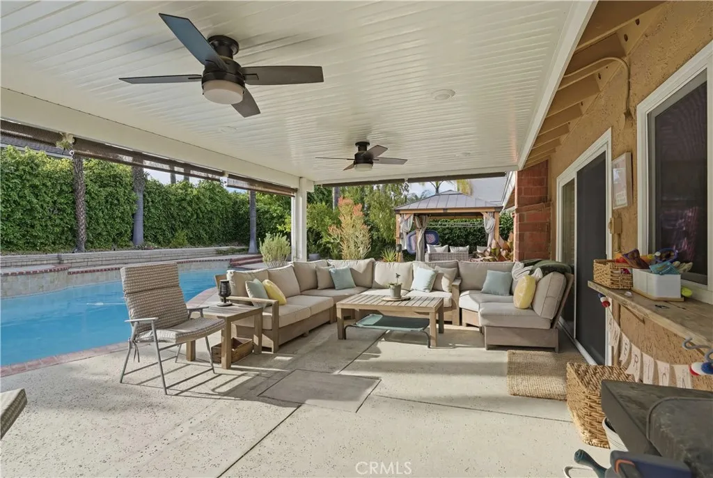 Valencia Pool Home beautifully upgraded 3-bedroom, 2-bath single-story nestled on a double cul-de-sac with NO HOA and NO Mello-Roos! Bonus OWNED SOLAR!!! This light-filled home features an open and inviting layout with recessed lighting, crown molding, tile flooring, dual-pane windows, plantation shutters, french doors, and ceiling fans. Recent upgrades include newer exterior paint, HVAC system, and newer pool equipment and pool plaster refresh. The spacious family room offers a cozy fireplace, abundant natural light, and serene backyard views, flowing seamlessly into the dining area. The upgraded kitchen is both stylish and functional, featuring granite countertops, upgraded cabinetry with pull-out drawers, quality appliances, and an open layout ideal for entertaining. The primary suite boasts high ceilings, mirrored wardrobe doors, and direct backyard access. The remodeled en-suite bath showcases a sleek glass-enclosed walk-in shower. Two additional bedrooms and an upgraded secondary bathroom complete the interior. Step outside to a true entertainers dream backyard. Enjoy a sparkling pool and spa surrounded by lush landscaping and beautiful hardscape. Two covered patio areas create the ultimate indoor-outdoor lifestyleone featuring a TV lounge space perfect for relaxing or game days, ideal for hosting gatherings year-round. Ideally located near top-rated schools, parks, Valencia paseos, shopping, dining, and easy freeway access. This home offers the perfect blend of comfort, style, and convenience. Dont miss this incredible opportunity to make this your next home!