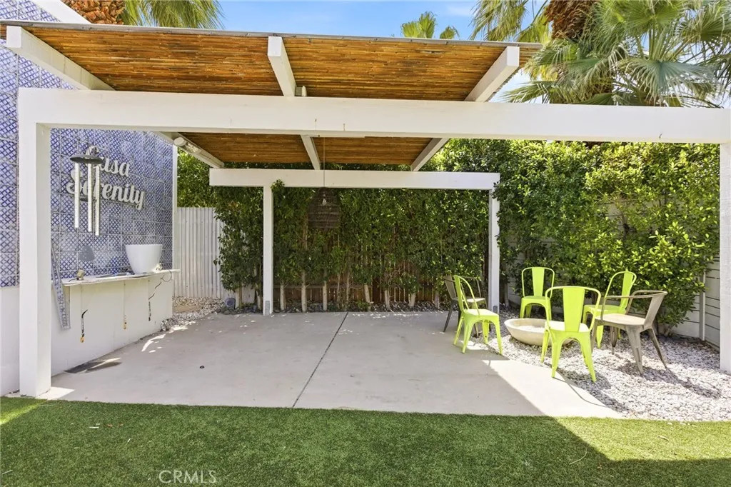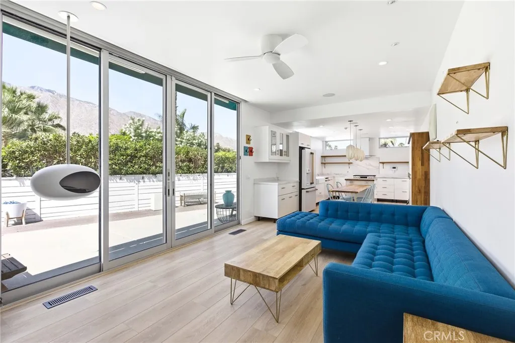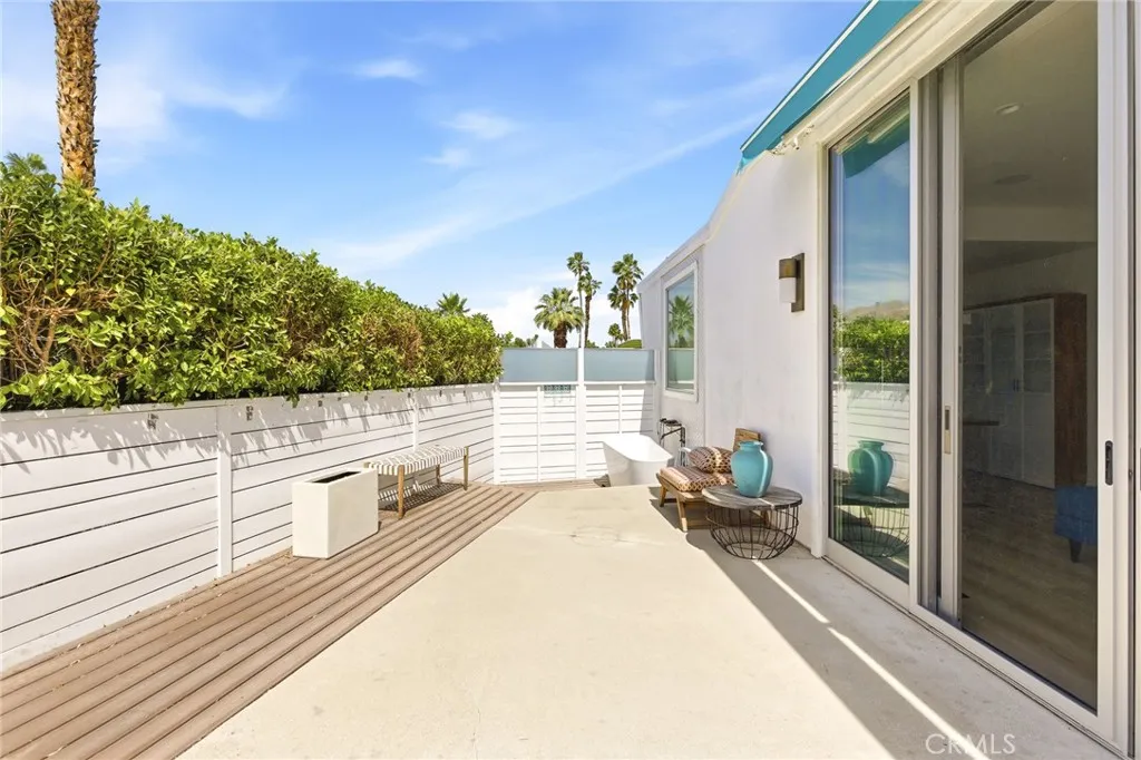 Wake up to sweeping mountain views from this charming DOUBLE-LOT RETREAT in the peaceful Warm Sands community. This thoughtfully designed home offers 690 sq ft of stylish living space with PLUS A DETACHED GUEST ROOM PERFECT FOR VISITORS, A STUDIO, OR PRIVATE WORKSPACE. The property welcomes you with a covered patio, spacious cement and wood deck, and a unique outdoor soaking tuban inviting setting to relax and take in the desert sky. Inside, the home blends modern style with warmth, featuring hardwood laminate flooring, quartz and wood countertops, crisp white appliances with elegant gold accents, sleek cabinetry and fixtures, and ceiling fans throughout. The custom bathroom showcases beautiful inlaid tile and modern finishes that create a timeless look and feel. Ramon Mobile Home Community 55+ offers a peaceful, quiet setting with nearby grocery stores, restaurants, and cafs for everyday convenience, along with bike-friendly streets, nearby schools, and easy access to parks and green spacesmaking this property not just a home, but a lifestyle.
