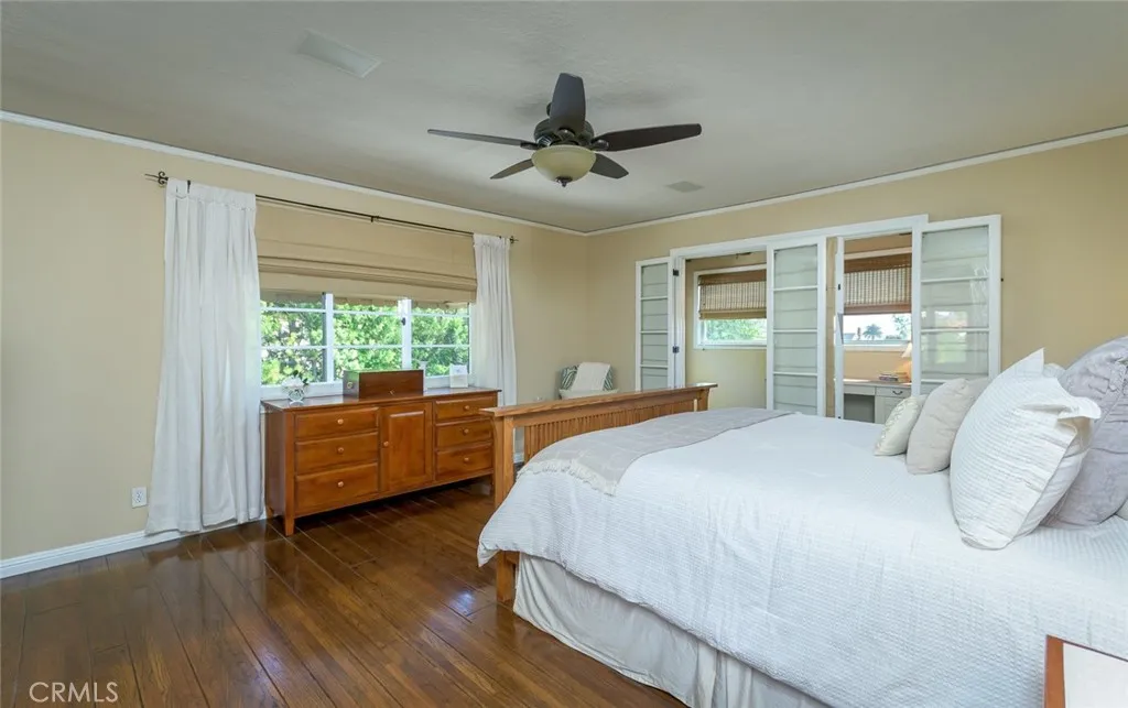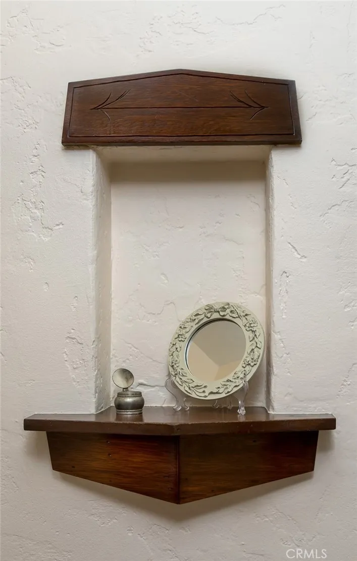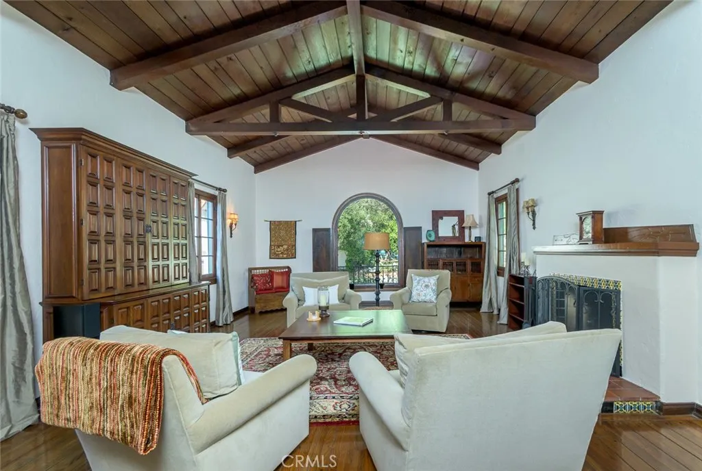 Spanish Revival Architecture is having a major moment and this home showcases all of the signature design elements that make this style so popular, features like arched doorways and a large picture window, dark wood ceiling beams, wood-framed French windows, wrought-iron railings and fixtures, a handsome fireplace and hearth trimmed in Spanish tiles, intricate carved wood detailing at the mantle and decorative lintels, and a delightful little niche in the hallway. From the moment you enter through the wrought iron gate, you're welcomed by a large, vibrant courtyard designed for entertaining or relaxing beside the peaceful fountain and outdoor fireplace. This blend of classic architecture from the 1920s has all of today's modern conveniences and luxury as well. The well-designed kitchen is outfitted with top-tier Wolf appliances, a Shaws handcrafted sink and custom Wood Mode easy-clean cabinets. (You'll have to look closely to find the seamlessly integrated refrigerator and dishwasher.) The charming breakfast nook with its built-in seating is perfect for morning coffee or a cozy casual dining area. This nook also offers a wall of cabinets and a lighted, glass display case. The adjacent laundry room provides additional cabinet space. One thing is for sure: you won't lack for cabinet space here! Polished peg and groove wood floors in the living room and formal dining room add to the richness and beauty of this home. Climb the wood staircase with its wrought-iron railing and experience the beauty of the large stained glass window above the landing. Upstairs, the spacious primar