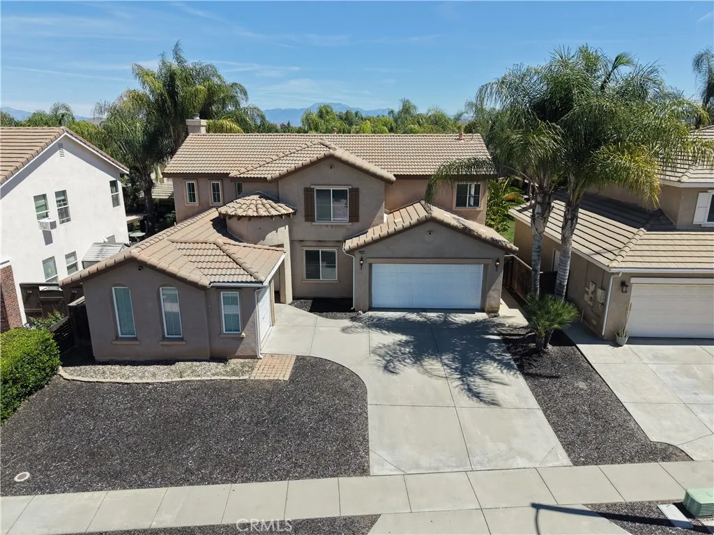 5 bedrooms and 3 baths two story home located in the Mapleton Community in Murrieta. This 2585 square foot home was built in 2002 and sits on a 6098 sqft lot with an amazing easy to maintain yard with an attached 2 car garage with direct access inside the home plus an extra attached single car garage for 3 total grage spaces. This home has been well taken care of throughout, with upgrades that include laminate wood floors and a light color paint scheme to bring lots of natural light, and ceiling fans throughout most of the home. When you enter the home, you are met with a hallway that leads to the spacious living room, featuring a fireplace and an open concept that connects with the kitchen. The kitchen features stainless steel appliances that include a free standing range, dishwasher and built in microwave. The kitchen is highlighted with quartz counters with kitchen island, a stainless steel double sink, recessed lighting and a ton of cabinet and counter space. Next to the kitchen, you will find the laundry room with washer and dryer included and more cabinet storage. Just off the kitchen, you will find the formaldining room with a chandelier overhead. Downstairs, you will find one of the bedrooms as well as a full bath. Once upstairs, the first bedroom is the primary suite. The primary suite features a a double door entry leading in the room. The room itself is quite large. The walk in closet features sliding doors and once inside there are shelves and plenty of room for storage. The primary bath has double sinks, soaking tub, and separate shower. The rest of the bedroom