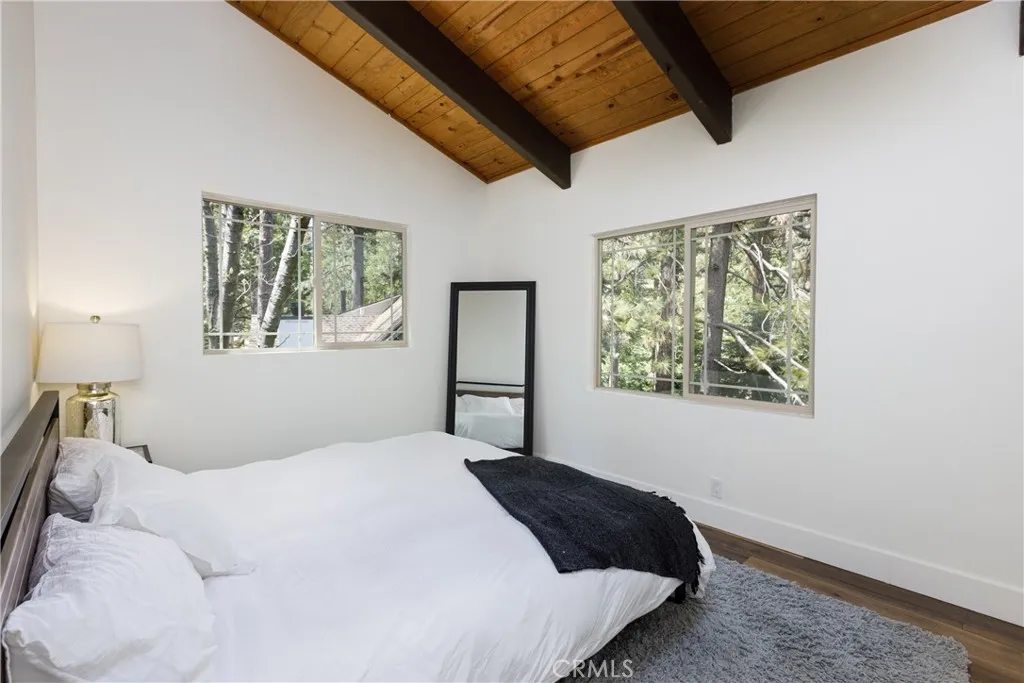 Beautifully remodeled Lake Arrowhead home with lake rights, blending modern design with warm mountain charm. Enjoy level street access and level entry into an extra-deep garage, ideal after a day at the lake. Inside, the dramatic living room features soaring wood-beamed ceilings and floor-to-ceiling windows, filling the space with natural light and framing serene tree views with a peek of the lake. The open layout flows to the dining area and updated galley kitchen, creating an inviting space for everyday living and entertaining. The fresh remodel showcases crisp white interiors, rich wood tones, and stylish lighting, offering a clean, elevated mountain aesthetic. Step outside to spacious composite decks, perfect for relaxing, dining, and enjoying the peaceful forest setting. Flexible floor plan includes main-level bedroom and bath, plus two upstairs bedrooms, full bath and a loft-style sitting area overlooking the living room. The finished lower level offers a large family room with access to a generous rear yard area. Major upgrades include Hardie cement siding (25-year color), 50-year roof, and dual-pane windows. Additional features: wood-burning fireplace with gas starter, direct garage access, underground utilities, additional driveway, covered front deck area and county-maintained/plowed road. Located just a short distance to the lake, shopping, and dining, this home is ideal as a full-time residence or weekend retreat. Furnishings may be availableturnkey opportunity.