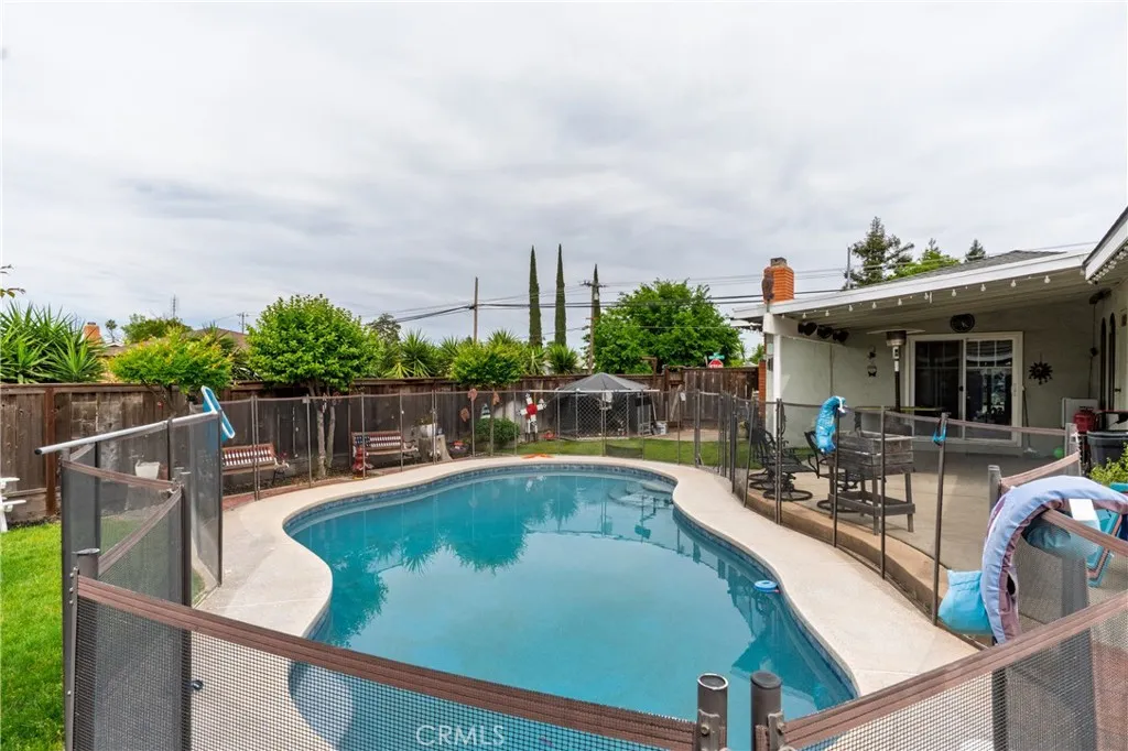 Corner Lot Pool Home with Expansive Backyard! Beautifully maintained and ideally situated on a desirable corner lot, this 3-bedroom, 2-bath home offers an exceptional blend of comfort, style, and functionality. From the professionally landscaped front yard and inviting front porch to the spacious backyard retreat. Step inside to a welcoming formal living room that effortlessly blends to the updated open-concept kitchen and dining area. Designed for both everyday living and entertaining, the kitchen showcases quartz countertops, a breakfast bar, gas oven, microwave, and plenty of workspace, while the adjoining dining area keeps everything connected. A separate family room adds additional living space and features a cozy brick fireplace along with a charming retro sliding door. The spacious primary suite serves as a private retreat, complete with a walk-in closet, sliding glass door access to the patio, and an updated ensuite bathroom featuring dual sinks, granite countertops, and a large tiled walk-in shower. Two additional bedrooms are generously sized, each with carpet flooring and ceiling fans. Step outside to your own backyard oasis, highlighted by an inground pool with Pebble-style decking, a covered patio, lush grass area, storage shed, and convenient side-yard access. Additional amenities include indoor laundry with a utility sink and quartz counters, a spacious 2-car garage, and a newer roof installed in 2021. Ideally located near schools, parks, shopping, dining, and commuter routes, this home offers peaceful neighborhood living with everyday convenience in the hear